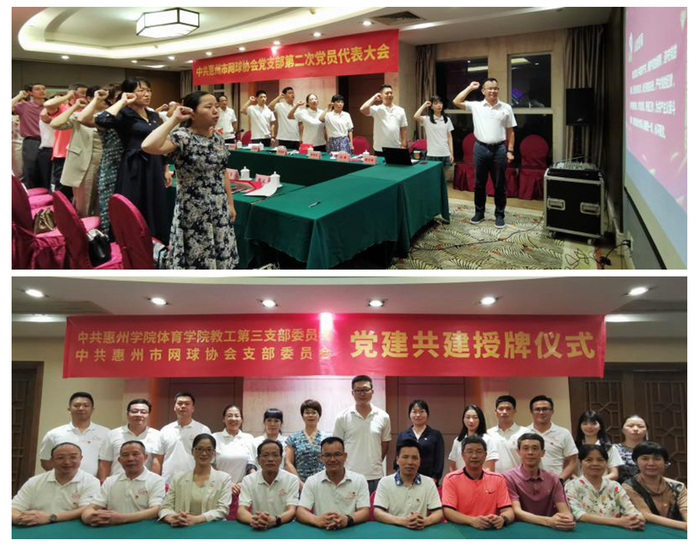 本网讯 近日,在建党99周年来临之际,体育学院教工第二、第三党支部分别与惠州市体育运动学校第二党支部、惠州市网球协会党支部开展了党建共建协议签约授牌仪式暨“双带头人”联学共建主题党日活动。