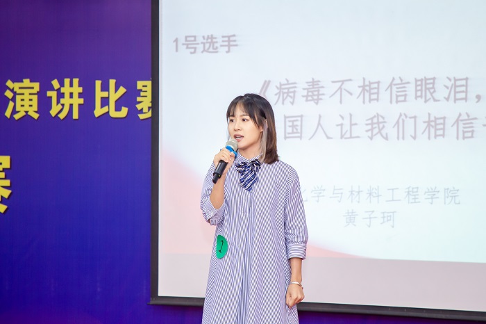 来自化学与材料工程学院的黄子珂以“病毒不相信眼泪,但中国人让我们相信奇迹”为主题,以亲身经历讲述了疫情中的感动与温暖,她的精彩演绎感染了现场观众,一举获得“最佳人气奖”。政法学院卢桂玲、地理与旅游学院张美晨和教育科学学院的吴婷通过战“疫”中闪耀的中国印记诠释了强大的中国力量和中国向心力。数学与统计学院陈颖莹、蔡耀谆生动描绘了00后责任于肩、逆风而行的中国好青年形象。音乐学院傅攒淇、文学与传媒学院邹婷婷传递了互帮互助的中国人、中国情,讴歌了党领导全国人民团结奋进、共同战役的光辉形象。外国语学院叶潼和体育学院陈志杰讲述了疫情无情、人间有情,疫情防控、师生共同行动的感人故事。选手们激情的演讲展现了在抗击疫情中中国共产党正确决策和中国特色社会主义制度的优越性,展现了中华民族在抗疫中的重大战略成果。精彩的演讲深深感染了现场嘉宾与观众,引得掌声不断。