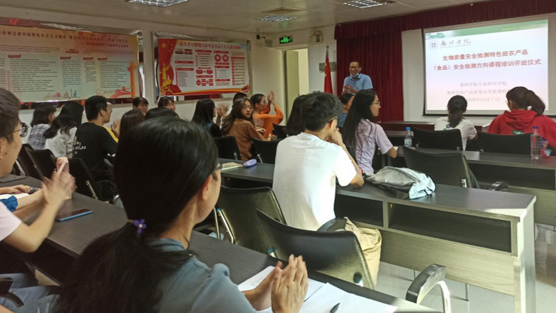 本网讯 11月7日下午,生命科学学院生物技术专业生物质量安全检测特色班23名同学,在谢海伟教授的带领下,来到惠州市农产品质量安全监督检测中心(简称农检中心),参加农产品质量安全检测课程培训。生物技术特色班18和19级农产品(食品)安全检测方向的学生参加了培训。