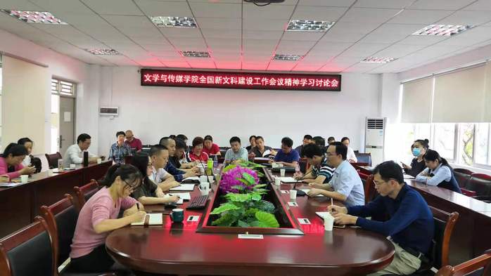 本网讯 11月18日下午,文学与传媒学院在旭日大楼422会议室召开新文科建设工作精神学习讨论会,教务处处长陈益智、学院领导班子成员以及全体教师参加了会议。会议由学院党总支书记赖常青主持。