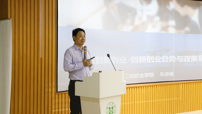 朱添锦副教授主要围绕着以下四方面进行内容讲解:一是对创新创业趋势的解读;二是创业政策导论;三是科技创新政策;四是大学生如何践行创业创新。