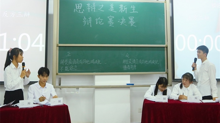 经过了初赛和复赛的筛选,学院共有 16位新生辩手凭借自己流利的口才和敏捷的思维进入本次决赛。辩手们分别围绕着“新闻价值是否比人伦道德更重要”和“肺炎造成的地域歧视是否情有可原”两个辩题展开了激烈的对辩。比赛期间,双方辩手口若悬河、妙语连珠的发言迅速将全场点燃,并将辩题立论与现实问题完美结合,全面地指出了自身观点的合理性与必要性。其中,自由辩论环节更是将比赛的气氛推向了高潮,双方辩手们据理力争、滔滔不绝,围绕对方辩论中的破绽展开了更加强势的争辩。此次比赛还新加了“奇袭”环节,这使比赛现场的火药味更加浓烈。提问环节中,观众们针对正反方辩论中的漏洞提出了自己的疑惑,辩手们也不甘示弱,坚守自己的辩题一一回答,他们清晰的思路与巧妙的陈词赢得了在场观众的阵阵掌声。