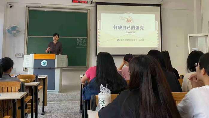 冯皓妍首先以李嘉诚的“鸡蛋理论”作为引子,进而指出学会教学的过程就是一次次打破自己蛋壳的过程。从学的角度出发,冯老师强调教学能力的提升,需要向经验学、向同伴学、勇于挑战、勇于尝试、乐于分享。随后从“不同角色教师的日常生活是怎样的?”“见习、实习经历中什么事情最重要?”“第一年的我是怎样度过的?”“如何学会教学”四个方面分享了自己如何在五年中迅速提升自己的数学教学能力。最后,建议同学们通过参与活动,拓宽广度;通过教学比赛,提高速度;通过课题研究,挖掘深度;通过日常阅读,积累厚度。