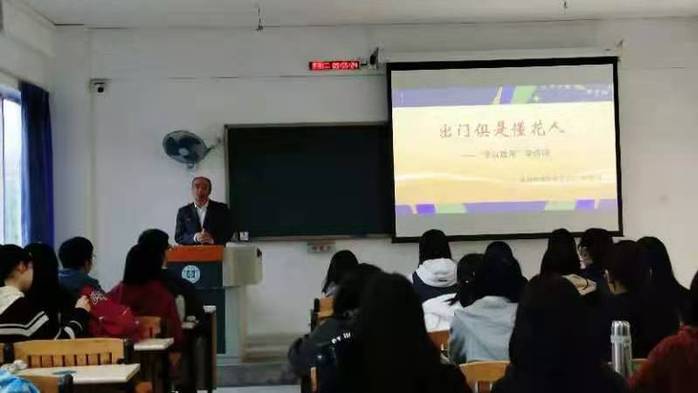 本网讯 12月8日上午,文学与传媒学院邀请了深圳科城实验学校高中组教师陈亚洲,对接文学与传媒学院副院长申东城的古代文学课堂,在旭日大楼213教室对18级汉语言文学2班进行了主题为《出门俱是懂花人——“学以致用”学诗词》的现场教学。