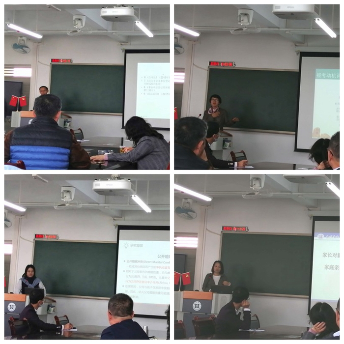 四位老师分别就各自研究的选题缘由(背景)、研究框架、研究思路、研究方法、研究内容、研究结论等与在座老师们进行了交流汇报。四位老师的研究选题新颖前沿,方法得当,既有质性的思考、也有量化的展演,这些对参会老师而言无疑是一顿丰盛的学术餐宴。老师们均表示深受启发,非常支持和欢迎类似学术活动的开展。