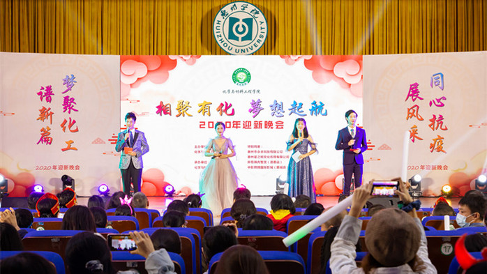 本网讯 12月5日晚,化学与材料工程学院2020年“相聚有化 梦想起航”迎新晚会在鹅城会议厅举办。惠州市永卓科技有限公司王细平总经理、鄢运涛行政经理,广东省博罗县文体旅游局副局长周丽芳女士,惠州市音乐家协会理事阳韶芝女士,惠州市捷丰润滑油有限公司黄明主董事长,学校学生工作部田翠华副部长,化学与材料工程学院院长刘国聪,党总支书记郭爱平、副书记张莉琼,副院长封科军博士、刘必富博士以及师生代表四百余人参加了活动。