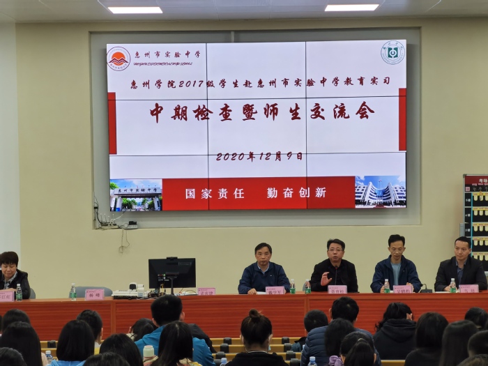 本网讯 12月9日,地理与旅游学院院长戴学军率队前往惠州市实验中学召开师范生教育实习中期检查座谈会。惠州市实验中学校长聂育松、副校长韦培、教务处主任孟庆建、实习指导老师以及我校在惠州市实验中学实习的全体实习生出席了座谈会。