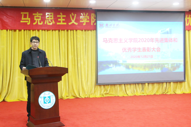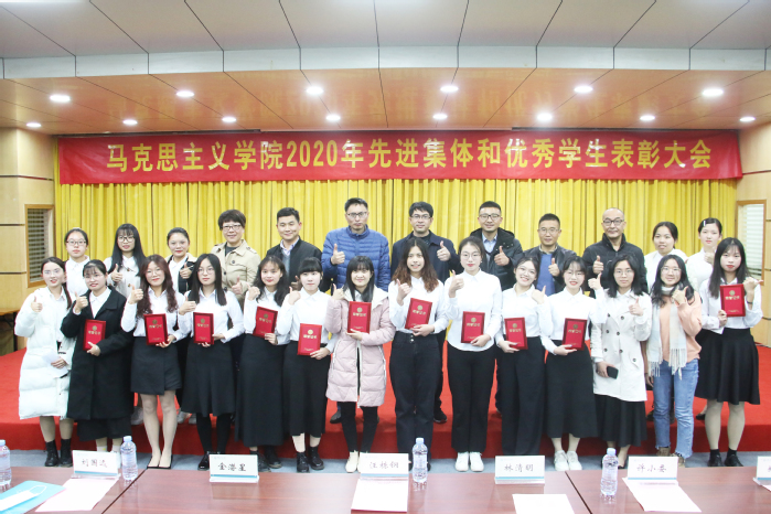 本网讯 12月21日晚,马克思主义学院2020年先进集体和优秀学生表彰大会在图书馆报告厅举行。学院领导班子成员、“潜心向学”奖助学金捐赠者汪栋钢先生和金潜星先生、各班主任老师以及马院全体学生参加了本次表彰大会。本次表彰大会共对国家奖学金、国家励志奖学金、校三好学生、各类竞赛获奖者、学风优良班级等17类146名先进个人、4个先进集体和团队进行了表彰。