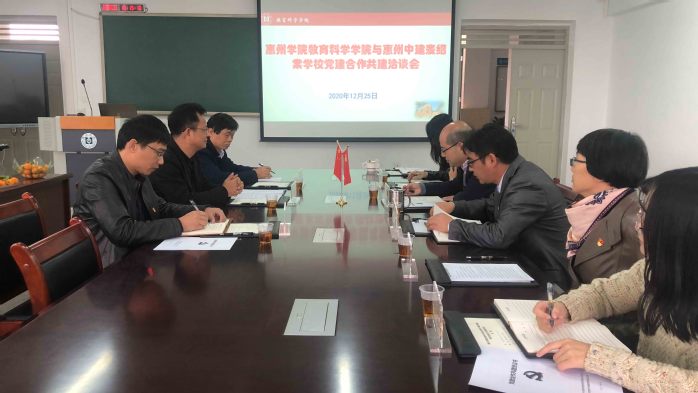 本网讯 12月25日,惠州市中建麦绍棠学校校长张学忠带队来到教育科学学院开展党建合作共建洽谈会,学院党总支书记谢伟强、副书记刘华、教师代表、辅导员参加了此次会议。会议由学院党总支副书记刘华主持。