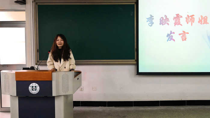 李映霞校友结合自己在校期间的学习和参加各种竞赛的经历和经验,分享教师资格证考试的笔试和面试详细经历和个人体会。她分析了三个科目的特点及自己总结出来的口诀记忆方法有助于同学们备考,特别在面试部分,她向师弟师妹们描述了结构化面试的过程,提醒大家应该注意的细节和技巧;二是分享她参加本科高校师范生教学技能大赛及其他竞赛的体会和经验,鼓励每一位同学都积极参加各种比赛,而且要有认真的态度,刻苦钻研精神,多争取机会锻炼自己,提升能力。在提问环节,同学们围绕考研、做家教、参加比赛、教师资格证考试及工作应聘等等问题踊跃提问,李映霞一一作了解答。