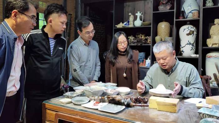本网讯 12月27日下午,惠州文化研究院院长陈梦、常务副院长张波、校党委宣传部副部长林少章以及惠州文化研究院合作单位叁壹艺术空间负责人冼华强、曾靖康等一行6人,赴惠阳区新田铺村的惠州市东平窑陶瓷文化园参观考察。惠州市东平窑瓷艺术研究院院长、国家一级美术师、惠州市陶瓷艺术家协会名誉会长余小伦先生参加了交流。
