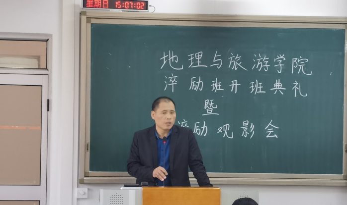 本网讯 11月29日下午,地理与旅游学院在旭日大楼312举办第一期淬励班开班典礼暨 “淬励观影会”活动,学院党总支副书记罗辉武、辅导员刁佩珍、淬励资助工作站同学及全体淬励班成员参加了本次活动,活动由淬励资助工作站郝道敏同学主持。