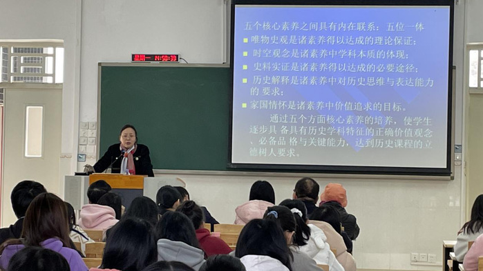 杜芳教授的讲座主要围绕基于核心素养的历史教学设计中的目标设计、内容设计等方面展开。关于历史教学目标的设计,杜芳教授详细指出了当前教学目标拟定中存在的问题,并主张通过准确的教学目标水平划分,划定教学目标拟定的基本要求,即准确性与可测性。关于教学内容设计的问题,杜芳教授认为要围绕课标,紧扣教科书,研究教学内容方面,在合理整合教学内容的同时,要尽可能达到教学内容的充实与精简。关于教学过程设计的问题,杜芳教授认为应教学环节应具有可操作性,情境的设计要注意灵活性与创新的统一。整场讲座内容详实、讲解生动,并辅以大量的正反案例,从而使得本次讲座既有高的站位,又通俗易懂。老师们均表示干货满满、收获颇丰,并对自身存在的疑惑和感兴趣的话题与杜芳教授进行了互动。