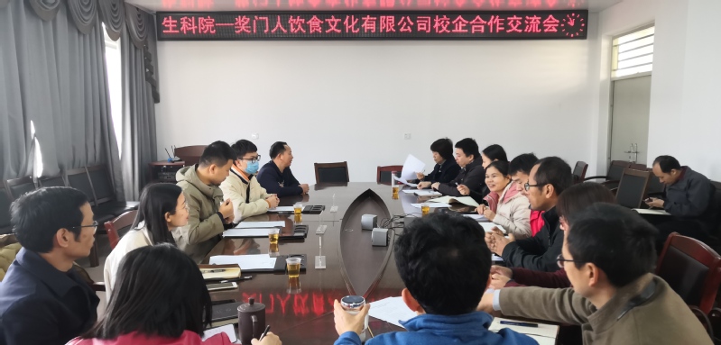本网讯 1月6日上午,惠州市奖门人饮食文化有限公司总经理刘新亮、副总经理马思焱等一行三人来我校生命科学学院,就校企合作进行了深入交流。执行院长周立斌、副院长林芳花、谢海伟及相关教师参加了交流,会议由林芳花副院长主持。