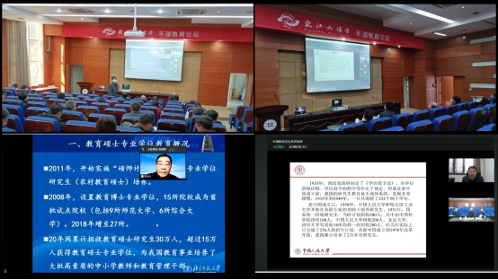 本网讯 1月19日下午,东江大讲堂第271-272讲暨丰湖教育论坛系列讲座在文城会议厅开讲。讲座特邀北京师范大学张斌贤教授,中国人民大学李立国教授两位学者,围绕教育硕士申报与研究生教育等主题开展线上学术报告。研究生处负责人,各二级学院分管科研副院长、华师联合培养硕士的全体兼职导师、师范专业系主任和教师代表、全校课程教学论任课教师、教育科学学院全体专任教师集中聆听了讲座。讲座由我校特聘教授陈伟主持。