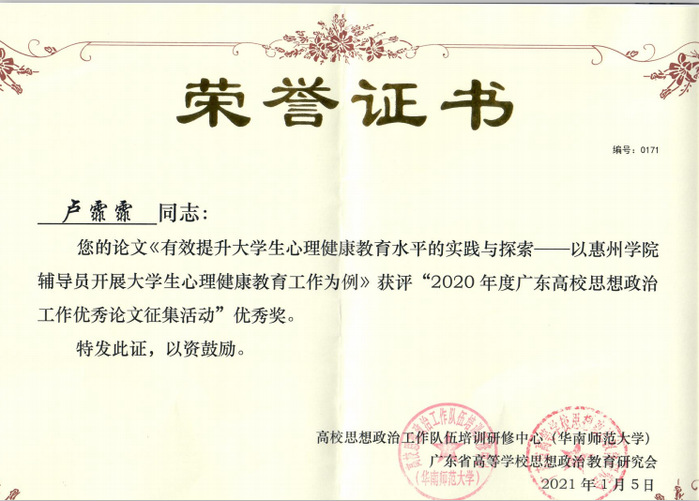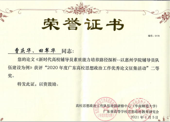 本网讯 近日,2020年度广东高校思想政治工作论文征集活动结果公布,我校党委学生工作部曹庆华、田翠华论文《新时代高校辅导员素质能力培养路径探析——以惠州学院辅导员队伍为例》荣获二等奖,美术与设计学院卢霏霏论文《有效提升大学生心理健康教育水平的实践与探索——以惠州学院辅导员开展大学生心理健康教育工作为例》荣获优秀奖。