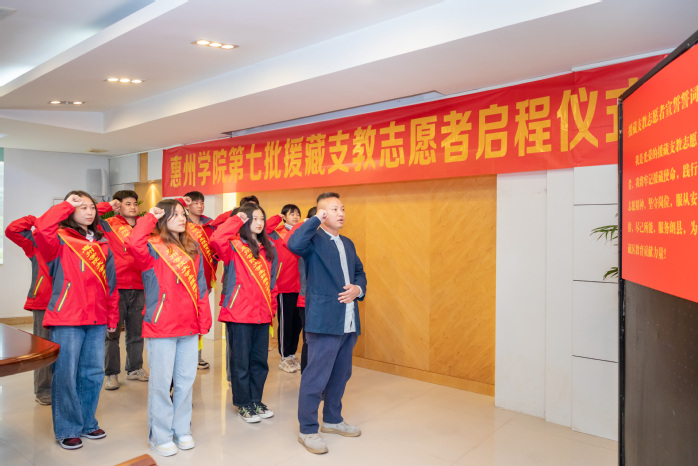 在带队老师美术与设计学院李辉老师的带领下,全体援藏学子庄重地举起右手在现场许下了为西藏朗县教育奉献青春力量的誓言。