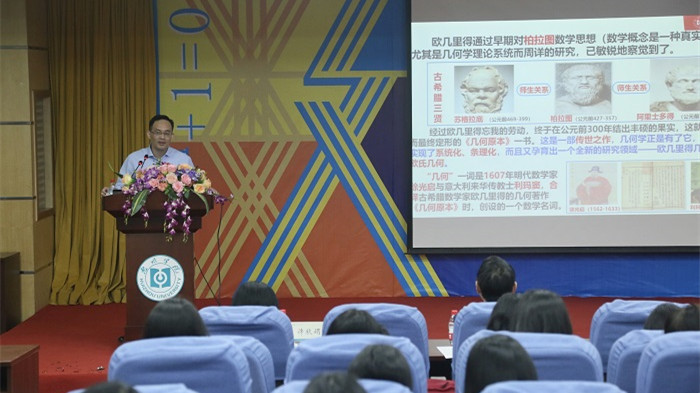 开幕式结束后,陈益智作首场专题讲座,讲座的主题为“数学是什么?数学有什么用?”。陈益智首先引用恩格斯的观点对数学的定义进行了阐述,回顾了欧几里得、陈省身、丘成桐、牛顿、刘徽、祖冲之、丢番图等著名数学家在数学方面所作的重要贡献,通过中外古今著名数学家典故,让同学们了解了数学三大分支几何学、代数学和分析学的发展历程、数学的两大分类以及数学的三个最显著特征;详尽介绍了数学作为基础学科在科学、人文和生活等各方面发展中的运用及重要性。最后,他引入“数学励志公式”,结合数学与统计学院院训“积微小,至宏大”,鼓励同学们每天进步一点点,为同学们更好地成长成才提出了非常宝贵的建议。他希望同学们通过此次讲座感悟数学精神,发现数学之美,培养周密的数学思维,形成良好的数学文化素养,真正将数学文化渗透到日常生活和课堂学习中。
