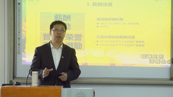 刘壮通过宣传片和PPT的形式针对该公司的整体概况、组织架构、发展模式、企业目标等进行了宣讲,他希望能吸引更多优秀的毕业生共同参与到联通公司的发展中来,也希望学院毕业生满怀信心,勇于挑战自己,拓宽自己的视野,发掘自己的潜力,主动把握就业机会,与企业共同成长。