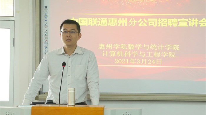 本网讯 3月24日上午,中国联通惠州分公司人力交资源与企业发展部副总经理刘壮率队来校举办招聘宣讲会,数学与统计学院、计算机科学与工程学院组织了2017级毕业班学生及2018级学生代表参加了招聘宣讲会,宣讲会由数学与统计学院党总支副书记陈海容主持。