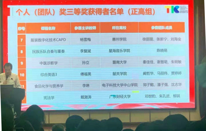 本网讯 4月9日至12日,“首届全国高校教师教学创新大赛广东分赛暨广东省高校教师教学创新大赛”在华南师范大学举行。经过紧张激烈的现场评审,我校旭日广东服装学院杨雪梅教授教学团队荣获正高组三等奖,计算机科学与工程学院王健海教学团队荣获中级组优秀奖。