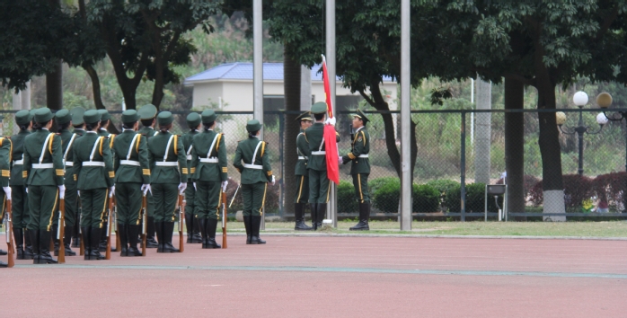 在第一缕晨曦的照耀下,学校国旗护卫队身着绿色军装,踏着整齐的步伐护送鲜艳的五星红旗入场,伴着国歌《义勇军进行曲》的响起,全体师生庄严肃穆地面对国旗,注视着国旗冉冉升起。