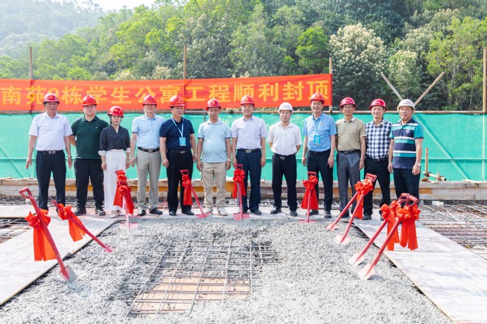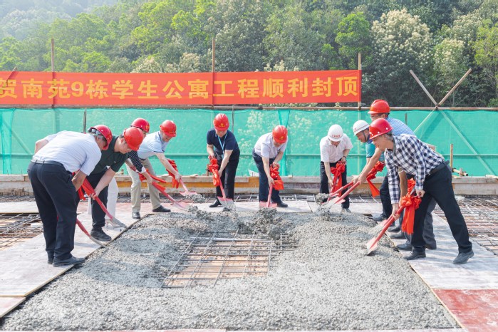 据悉,此次封顶的南苑9栋学生公寓项目总建筑面积达7328.72㎡,共7层、135间宿舍,可容纳804名学生入住,计划于今年9月投入使用。