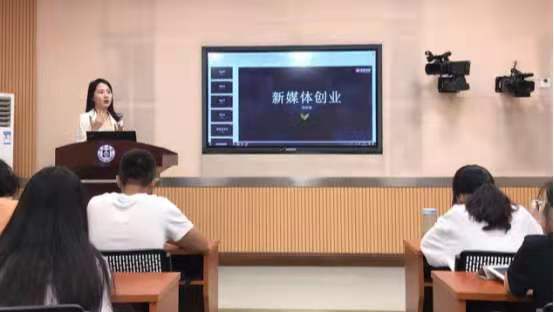 洪泽锦结合个人经历,为同学们分享了她从学校踏入社会的转变过程。她表示自己在多段实习经历中积累了宝贵的实践经验,为以后的职业生涯发展打好了基础。她认为同学们在大三阶段应多考虑未来的择业方向,在实践中寻找适合自己的职业道路。洪泽锦还分析了新媒体行业的发展现状,介绍了噗通传媒目前的运营现况和发展方向,展示了旗下品牌IP账号的创作内容和成果。她表示,新媒体领域充满机遇与挑战,从业者要在工作中不断地锻炼能力,提升自我,才能更好地适应行业的发展。