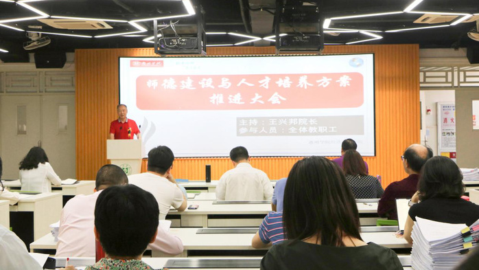 会上,学院党总支书记郑良才作题为《立德树人:高水平人才体系建设的核心——遵守职业规范 守好师德底线》的讲话。他带领全体教职工重温了习近平总书记对广大教师提出的“四有好老师”、“四个引路人”、“四个相统一”等要求,就《新时代高校教师职业行为十项准则》、《教育部关于高校教师师德失范行为处理的指导意见》等文件进行了解读,强调了在新形势下加强师德师风建设的重要性。随后,分析了当前高校教师在师德师风上存在的问题,并结合教育部通报的部分高校教师师德失范典型案例进行了警示教育。他希望全体教师从案例中汲取教训、引以为戒、警钟长鸣,不断增强拒腐防变的思想自觉和行动自觉。他要求全体教职工牢记立德树人的使命,履行教书育人的职责,做到明道信道、立德垂范、业精善学、敬业爱生。