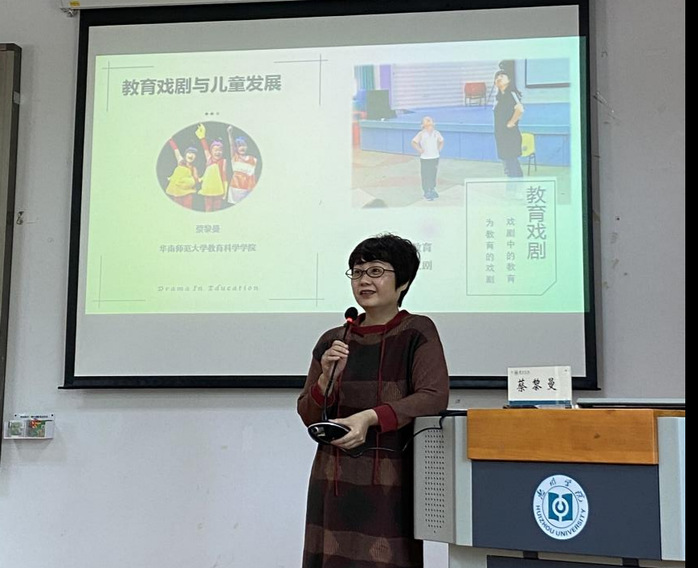 本网讯 4月29日下午,华南师范大学教育科学学院原教育系主任蔡黎曼教授应邀来教育科学学院作题为“教育戏剧与儿童发展”主题讲座,教育科学学院师生90多人聆听了讲座。讲座由学前教育专业负责人饶淑园教授主持。