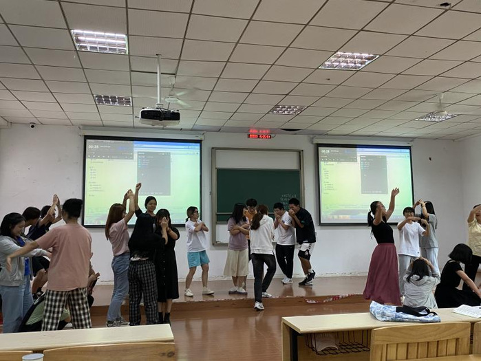 看见同学们逐渐进入了状态,蔡黎曼教授再次邀请同学们上台进行更加完整的表演。在给同学们详细分析了《巨人与春天》的绘本后便开始正式表演。“北风呼啸的冬天,大雪纷飞,一片荒芜,巨人们在积雪中迈着沉重的步伐,终于回到了自己的小屋,随着春天的到来,巨人们同万物一起苏醒,一切都是美好的,阳光明媚,鸟语花香...”,伴随着音乐以及蔡黎曼教授绘声绘色的旁白,无论台上还是台下的同学都集中在表演当中,哪怕故事结束了,大家的表演也没有停止。从不适应到能大胆表现,同学们在蔡黎曼教授的带领下思维和表现力都在同步提升。