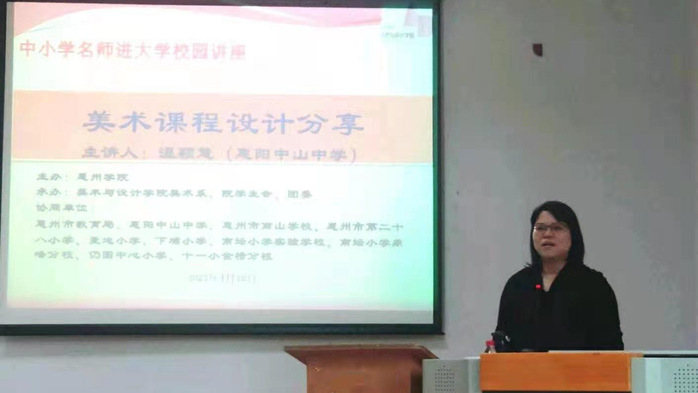 本网讯 4月15日上午,美术与设计学院邀请惠州市惠阳中山中学温颖慧老师在田家炳大楼101课室开展一场以美术课程设计为主题的专题讲座,2018、2019级美术学全体学生生聆听了本次讲座。讲座由学院副院长吴冠聪主持。本次活动由教务处主办,美术与设计学院承办。