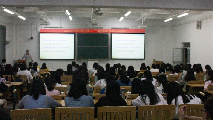 本网讯 5月7日晚,数学与统计学院在旭日大楼106举办考研经验分享会,学院副院长赵显贵、党总支副书记陈海容、各系部主任、思政导师王海青、辅导员,2018、2019、2020级学生代表参加本次分享会,学院针对专业方向、录取学校地域等从2017级考研成功学生选派较有代表性的六名同学进行了经验分享。他们分别是2017级数学3班黄俊辉和陈晓兰、2017级数学4班李玟和刘柯邑、2017级统计1班郑佳玲和汤桔铭。