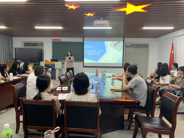 本网讯 5月5日晚,惠州城市职业学院林楚冰老师来教育科学学院就“互联网+”大学生创新创业大赛进行针对性指导。会议在学院621会议室召开,学院副院长谢桂新、学前教育系主任黄国庭、胡娇、王昭智、张越、麦日岸等老师和辅导员范红依以及参赛队伍代表50多人参加了会议。
