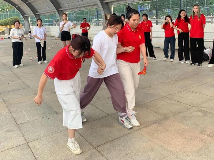 学生党员同志们通过红军长征系列活动——四渡赤水、飞夺泸定桥、深夜过草坪、胜利会师几个游戏结合红色故事独白的活动形式。同时,三位党员同志通过三人四足来回横渡四次规定的距离来体验“四渡赤水、飞夺泸定桥”等感受体验当时的艰辛。