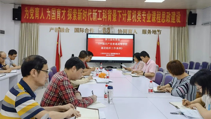 本网讯 4月28日下午,计算机科学与工程学院教工党支部组织专题学习《中国共产党普通高等学校基层组织工作条例》(以下简称《条例》),学院教职工党员共40余人参加了学习讨论。学院党总支书记陈璐同志对《条例》各章节进行了领学和全文解读。学习会由教工党支部书记王震同志主持。