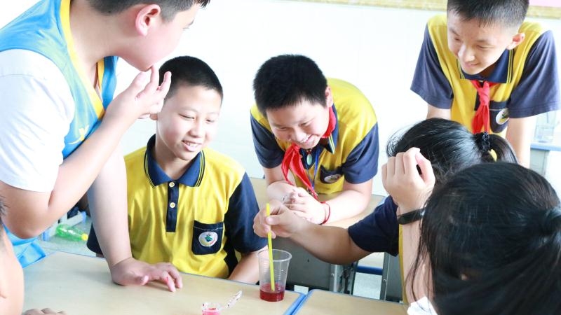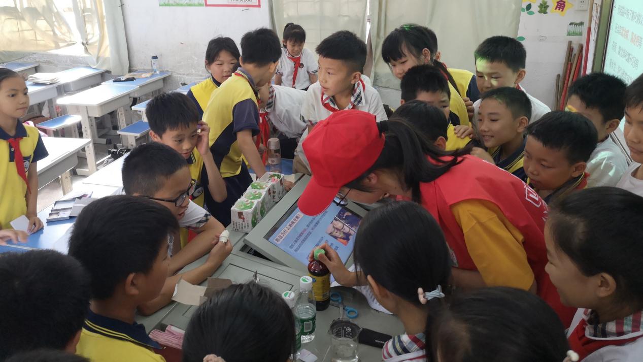 课上,每一位同学端坐在位置上专心致志地聆听志愿者们的讲解,紧跟着“小老师们”的步伐学习如何保护自然,了解生活中奇妙的化学反应。小学生们积极与志愿者互动,争相地回答问题,提出疑问,志愿者们妙趣横生的科普课堂与同学们的奇思妙想形成了有趣的化学反应。