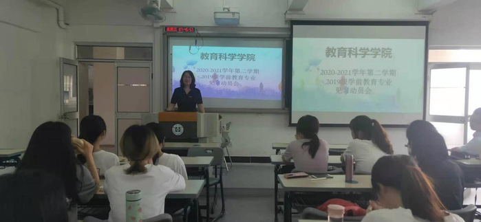 5月14日,教育科学学院2019级学前教育专业学生在旭日大楼308举行了见习(研习)动员大会,教育科学学院副院长谢桂新老师、学前教育系主任黄国庭老师、2019级1班班主任林冬鸿老师、19级2班班主任段飞艳老师以及2019级全体学前教育专业学生参加了本次活动。会上,谢桂新与黄国庭分别就本次见习(研习)活动提出了相关的注意事项和见习(研习)内容安排,并嘱咐同学们提前准备好每日入园教学活动方案,鼓励同学们见习(研习)期间能主动参加幼儿园班级活动教学与组织,积极配合好幼儿园安排的活动事务等。