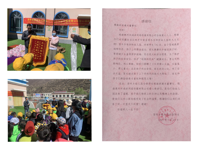 本网讯 近日,我校计算机科学与工程学院2008级校友卓建术收到一份特殊的感谢信和锦旗,它们来自西藏登木乡小学附属幼儿园全体师生,以表达对卓建术校友及惠州市鸿卓网络传媒有限公司全体同仁爱心捐赠安全头盔等物资的感激之情。