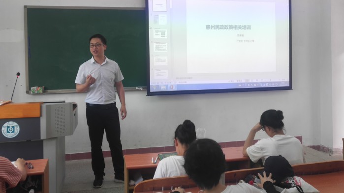 李海强以扎实的理论基础、丰富的工作经验为内容,风趣幽默地为学生讲授了惠州市民政政策在基层的落实情况。课程以惠州市民政政策为例,一是讲述了社会救助工作中常遇的四个内容,即最低生活保障,特困人员供养,医疗救助和临时救助;二是分别对这四个方面的救助的对象、标准、内容及办理程序进行了详细的讲解;三是联系具体的工作案例和政策题目,与学生进行深入交流,促进理解和掌握。