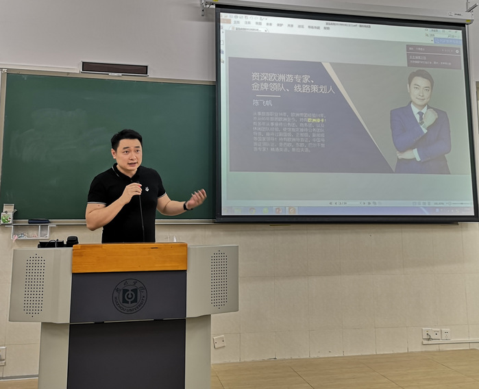 当天晚上,陈飞帆校友又深入“旅游休闲策划”课堂,为选修该课程的同学进行作业点评,并以一条欧洲游线路为例,介绍了具体的策划过程。