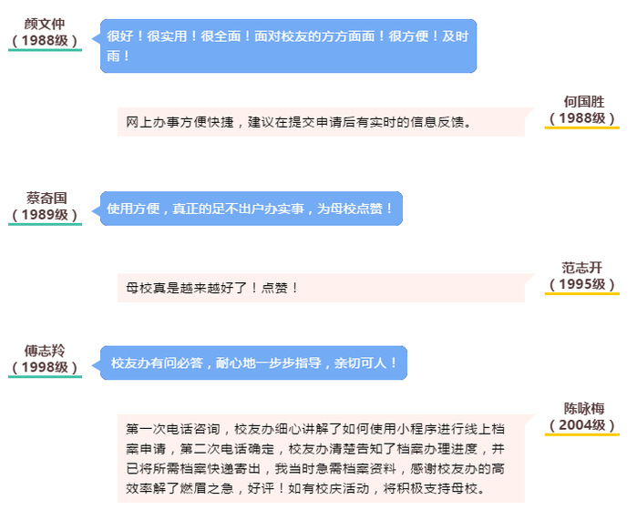 本网讯 “很实用,及时雨!”“真正的足不出户办实事!点赞!”“实用、便捷、贴心!”近期,我校校友办不断收到来自校友们对校友服务平台“网上办事”新功能的体验反馈。从广大校友的反馈来看,大家对此功能均给予了满意评价。