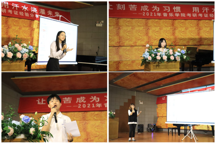 四位成功考研、考证学生代表根据自身的经历作经验分享。2017级表演2班唐征帆(现考取西藏大学舞蹈编导专业硕士研究生)从疫情给自己带来的思考,到坚定选择考研和考研路上遇到的困难,考研路上坚持和自律的重要性。2017音乐表演2班刘思远(现考取云南民族大学体育瑜伽专业硕士研究生)细心地讲解考研的前期准备以及备考调剂考试的各项要点,讲解了学硕与专硕的不同之处,以及择校的重要性,激励师弟师妹们“越努力越幸运”。2017音乐学2班李思敏(通过了高中音乐教师资格证)作考教师资格证的经验分享,从考试题型、选择备考资料、面试过程中的各种有趣的心理战术,并对报考时间的重要性作了详细的分享。2018音乐学2班魏小婷(通过了高中音乐教师资格证)强调考试前期要注重刷课以及总结笔记,考试中期整理思维导图以及背诵考点,考试后期要计时刷题等进行详细的备考经验分享。