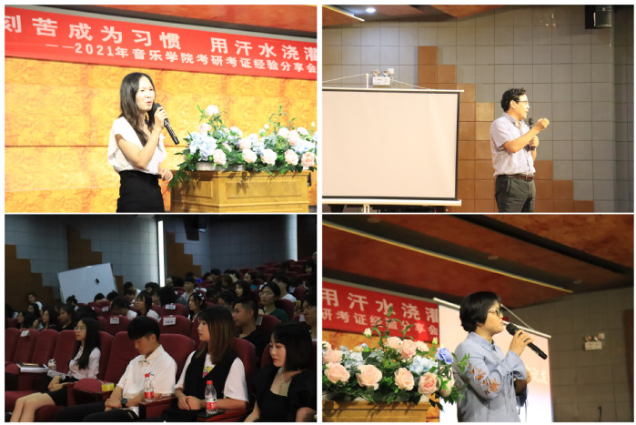 本网讯 5月20日下午,音乐学院在音乐楼101排演厅举办以“让刻苦成为习惯 用汗水浇灌未来” 为主题的考研考教师资格证经验分享会。音乐学院党政领导班子、辅导员、教师代表、2019级和2020级全体学生和其他年级学生代表约200人参加了本次会议。