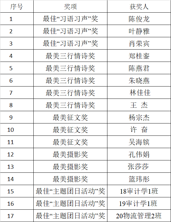 本次活动线上和线下结合开展,是学院贯彻“三全育人”工作理念,深入开展党史学习教育的一项重要活动。活动自举办以来,便赢得学生们的热切关注和参与,大家积极学习“五四精神”,踊跃提交相关作品。通过作品展现青年风采,抒发青年志向,用生动的表达体现当代学子爱党、爱国之情。经过层层筛选,最终17位同学的作品获奖。