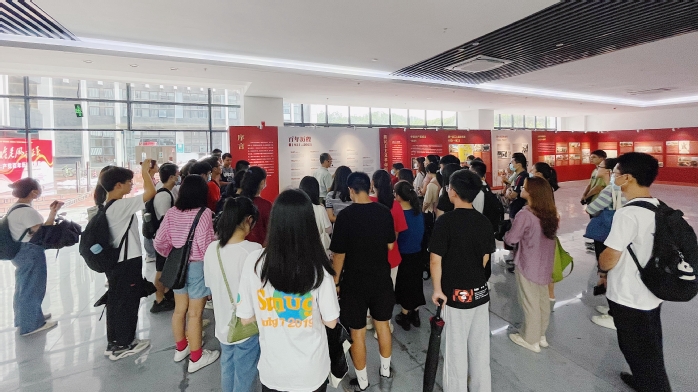 本网讯 6月29日下午,我校一百名学生解说员在科技产业大楼一楼大厅开展第四场党史学习教育“100”名学生解说员专题培训会,实地参观《“百年恰是风华正茂”——中国共产党百年历史回顾展》,由马克思主义学院许安朝博士进行串讲及指导培训。