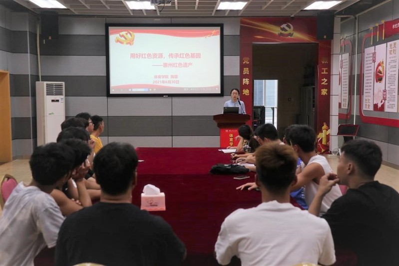 本网讯 6月30日下午,体育学院在党员活动中心召开入党积极分子培训暨党史专题学习会,体育学院党总支副书记陶蓉以“用好红色资源,传承红色基因——惠州红色遗产”为主题,为体育学院64期入党积极分子讲授党课。