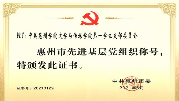 本网讯 在庆祝中国共产党成立100周年之际,为表彰先进、弘扬正气、树立标杆,进一步激励广大党员干部不忘初心、牢记使命,中共惠州市委表彰了一批优秀共产党员、优秀党务工作者和先进基层党组织。我校文学与传媒学院第一学生党支部被评为“惠州市先进基层党组织”。获奖证书近年来,学校党委牢牢把握新时代党的建设总要求,全面贯彻党的教育方针,坚持社会主义办学方向,牢固树立党的一切工作到支部的鲜明导向,积极推进基层党组织标准化、规范化、品牌化建设,以高质量党建落实立德树人根本任务。