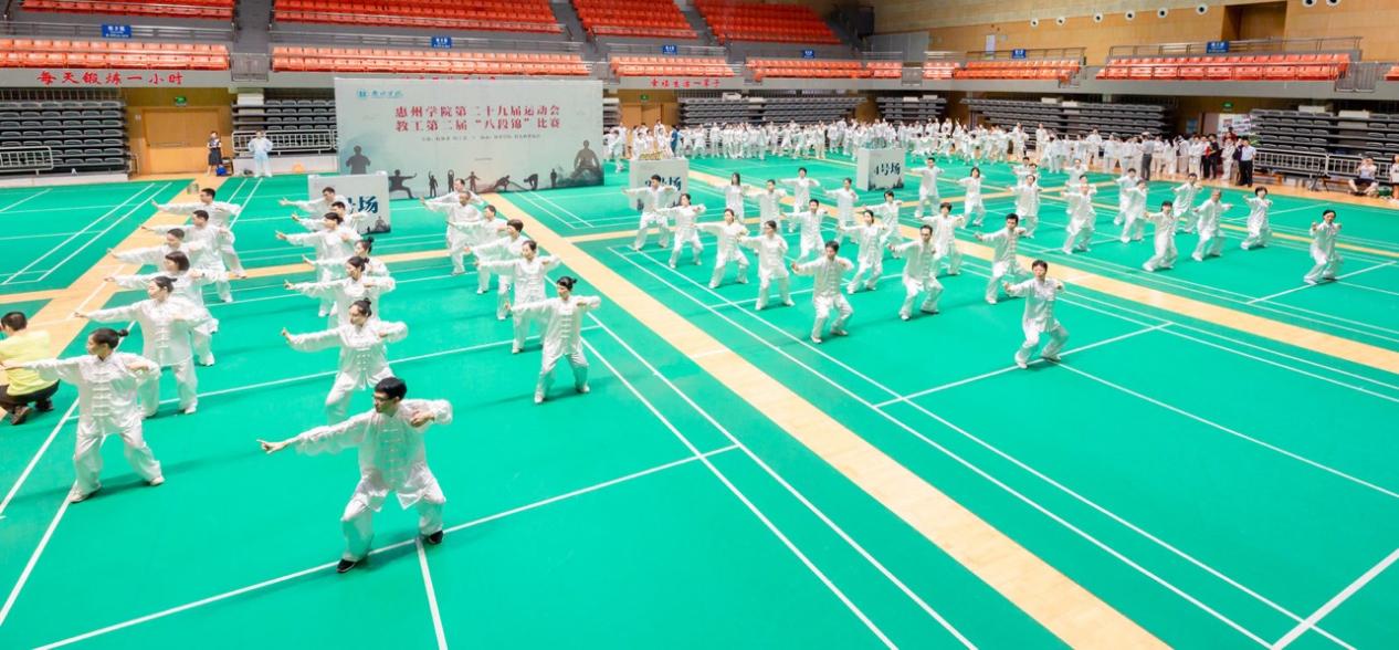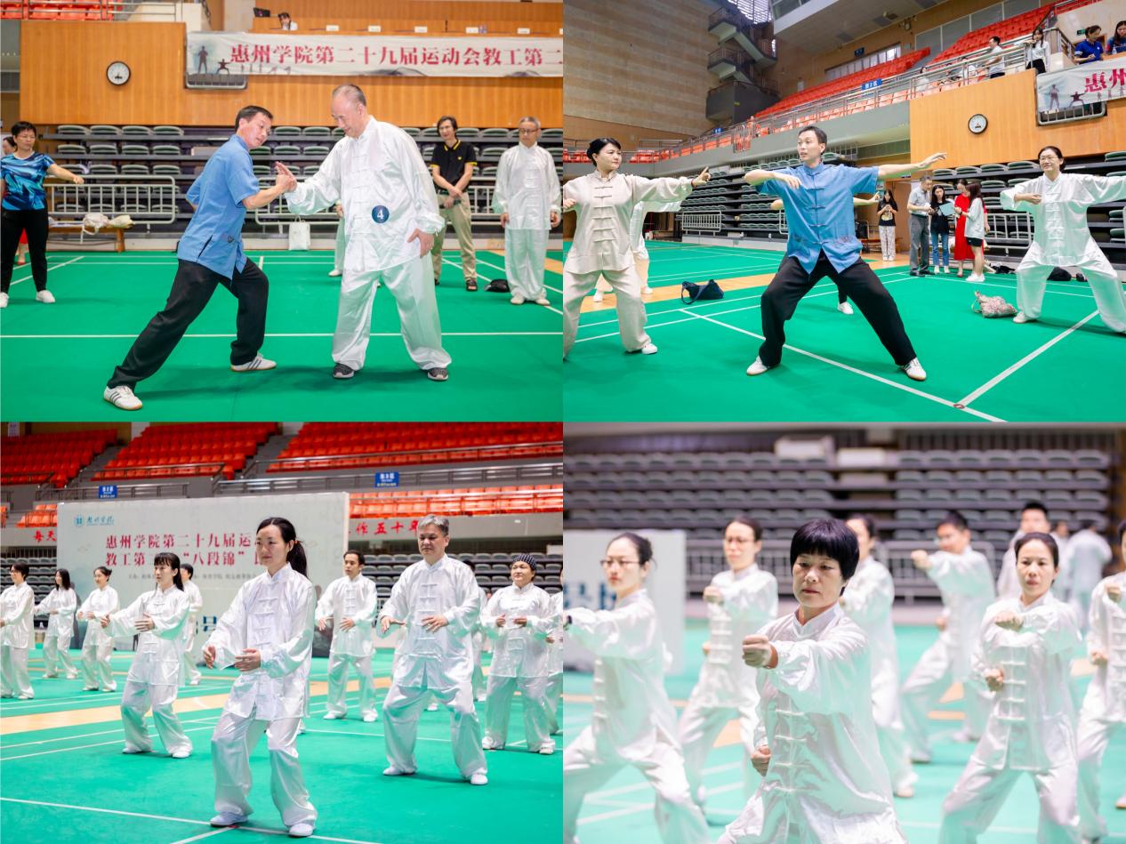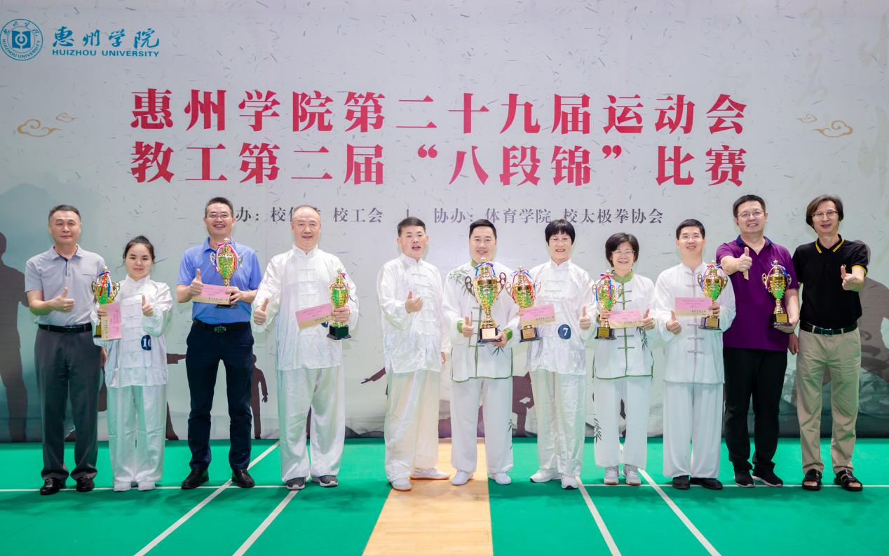 比赛裁判长、惠州市体育运动学校党总支书记、副校长、国家级健身气功社会体育指导员肖剑老师还现场与教工们互动“八段锦”技术,并对我校本次比赛的赛事组织、技术水平等表示了肯定。