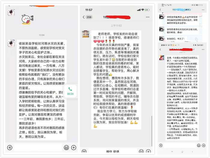 本网讯 “没有复杂的手续,没有多言的话语,却有最真挚的感情,最迫不及待的支援,感谢惠院!”2020级社工专业刘同学银行卡收到一笔来自学校的5000元困难临时补助金后,立即在微信群表达了自己和家人的感动。近日,河南等地持续遭遇强降雨,身处灾区的惠院学子是所有惠院人心中最深的牵挂。为帮助我校受灾学生及家庭渡过难关,学校第一时间启动救助机制,于7月21日紧急开通“抗灾临时困难补助申请通道”,学校组织辅导员、班主任通过电话、QQ和微信与所有河南籍学生取得联系,逐一确认学生是否平安,并对受灾学生表示关怀。